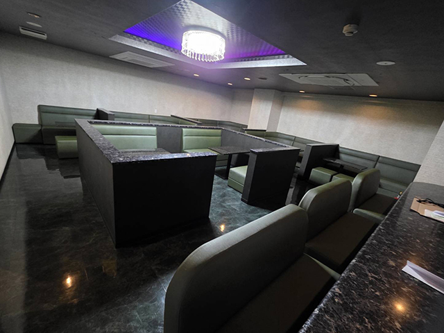 カウンターやボックス席、天井照明などの造作部分は一部再利用しながら、壁面クロスや床材の貼り替え、ソファの張り替え・再配置を行い、落ち着いた高級感のある空間へと刷新。
